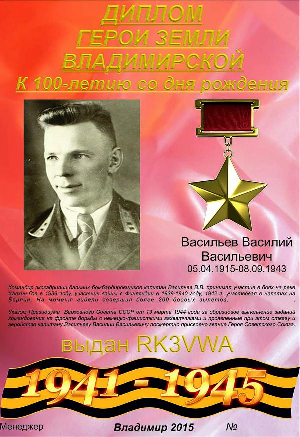 C 20 марта по 17 апреля 2015 года можно получить диплом посвященный Герою Советского Союза Васильеву Василию Васильевичу.