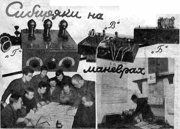 Сверху — передатчики и приемники участвовавшие в маневрах. Внизу — участники маневров за работой и комната Сибирской.СКВ.