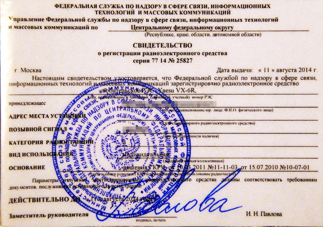 3. В течении недели с момента получения ваших документов вам будут подготовлено Разрешение на эксплуатацию РЭС, о чем обычно извещают. Вы сможете его забрать лично посетив Роскомнадзор, или же дождаться заказного письма на Почте России (об этом способе доставки лучше заранее предупредить, сложив дополнительную записку с просьбой переслать Разрешение почтой).