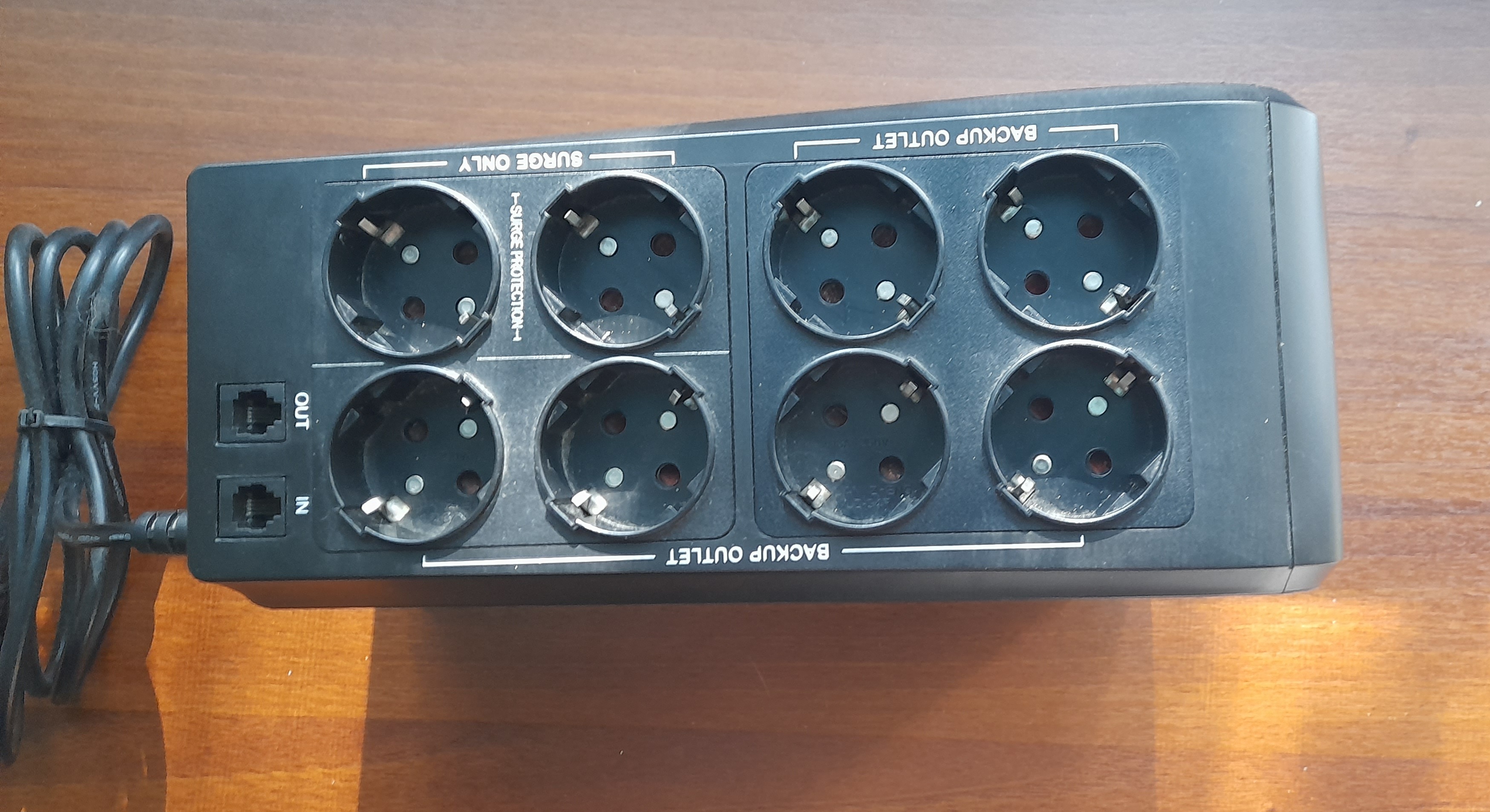 Для удобства пользователя модификация Back Combo Pro оборудована 8 розетками европейского типа. Все розетки расположены на верхней плоскости корпуса ИБП, шесть из которых обладают батарейной поддержкой, а две оставшиеся обеспечивают только сетевую фильтрацию. Также сверху находятся 2 разъёма для защиты телефонной линии от помех/скачков напряжения.