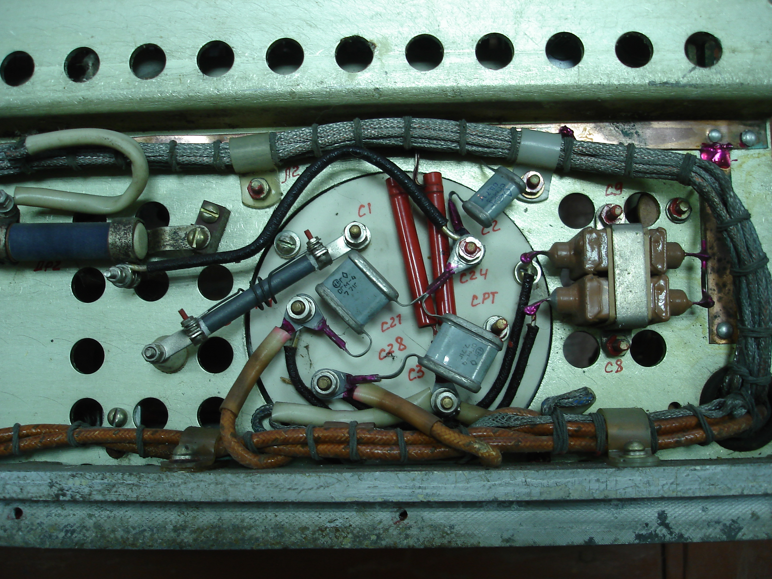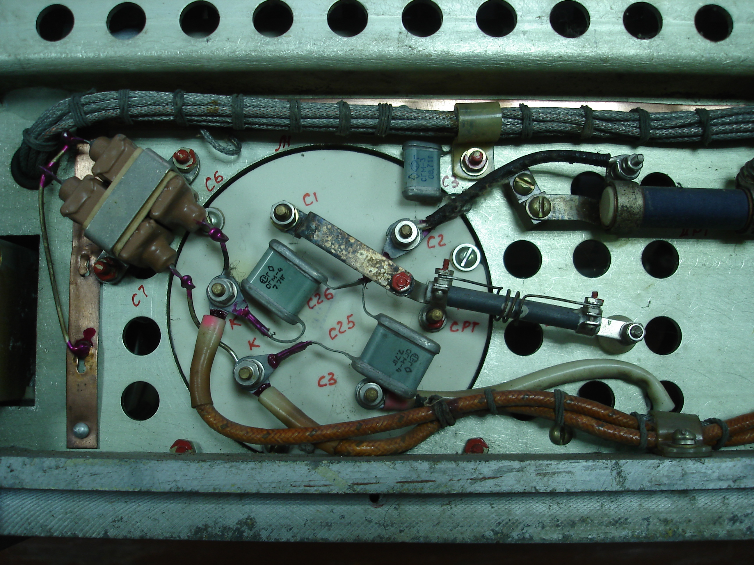 Еще интересно что за "кирпичики" коричневые попарно прикручены ленточными скобами. Выводы с одной стороны подключены к накалу, он же катод. С другой стороны припаяны к на землю. Вродь конденсаторы... Но почему такое исполнение, будто бы это проходные конденсаторы или вдруг еще чего :shock: Сам же корпус у них вряд ли имеет контакт с шасси.