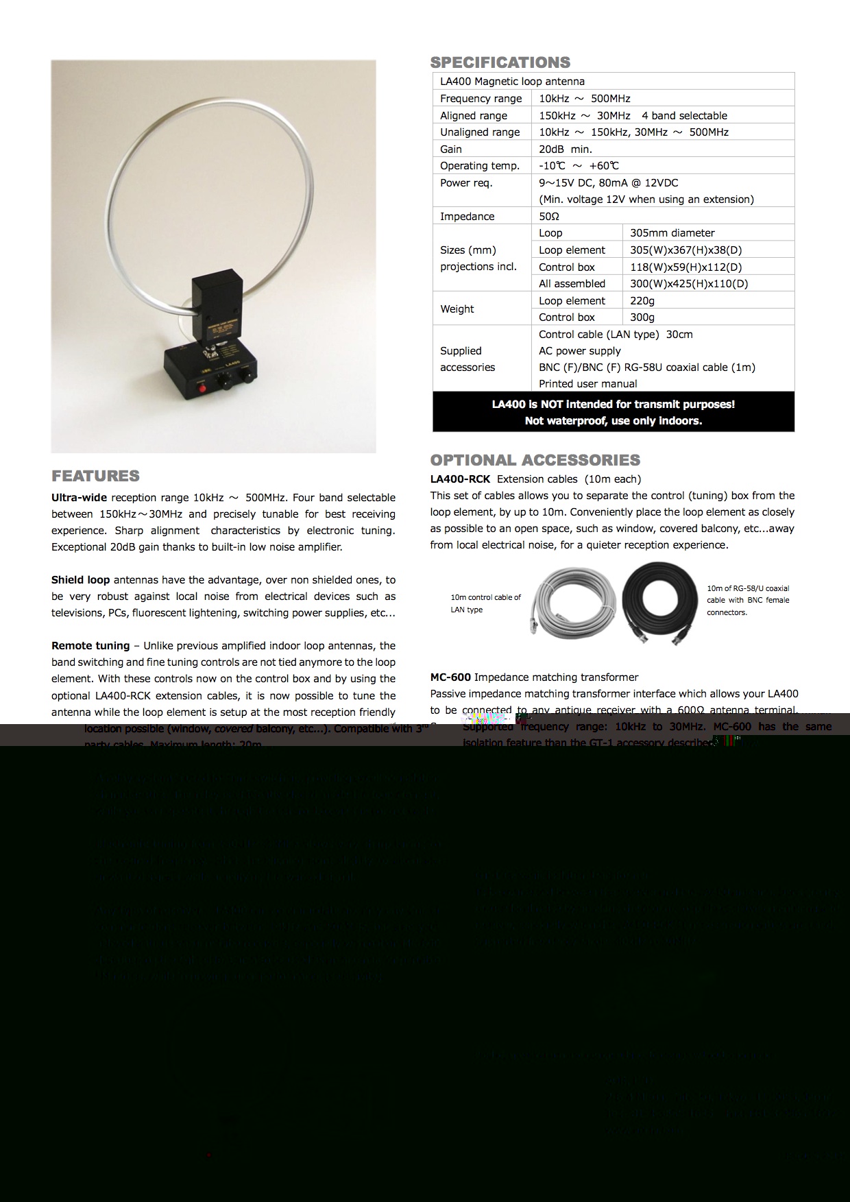 1. MLA (Magnetic Loop Antenna), как эта - LA400, в отличие от любых проволочных антенн - РЕЗОНАНСНАЯ! На любую частоту можно подстроиться и улучшить прием. Хотя эту функцию легко применить и для проволочных антенн с помощью тюнера и др. подобных согласующих устройств.