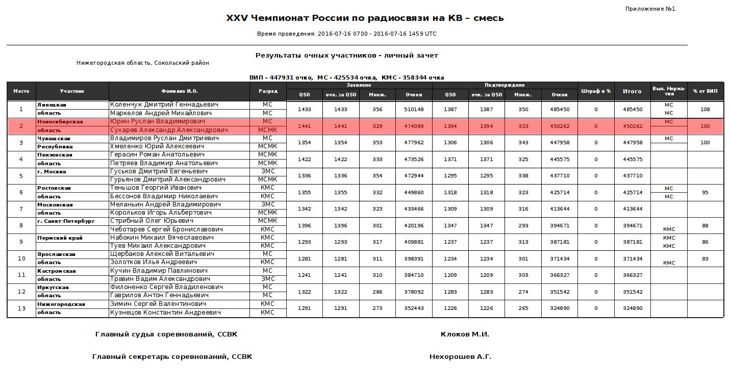 16 июля 2016 г. проходил XXV Чемпионат России по радиосвязи на КВ. Соревнования проводились в Нижегородской области с 07:00 до 14:59 UTC на диапазонах 40, 20, 15 и 10м, модуляция CW и SSB.